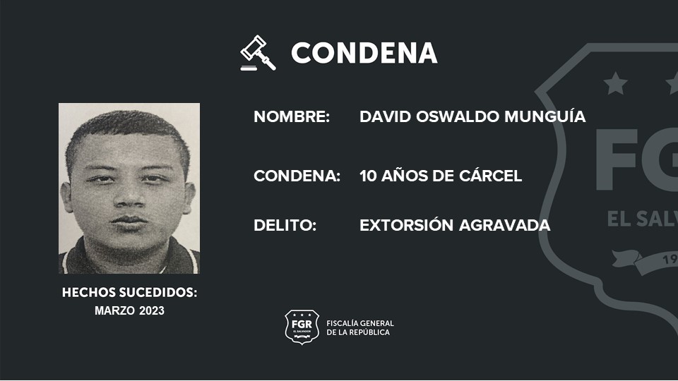 La Libertad Este. La Fiscalía General de la República (FGR) logró 10 años de cárcel para el pandillero de la MS-13, David Oswaldo Munguía, por haber extorsionado a una víctima de San Juan Opico, La Libertad Centro.