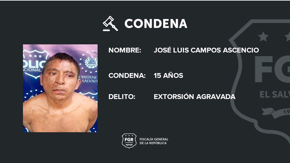 Sonsonate. La Fiscalía General de la República obtuvo un resultado condenatorio en contra de un terrorista de la Mara Salvatrucha identificado como José Luis Campos Ascencio, alias “inquieto” por haber resultado culpable de haber cometido el delito de Extorsión Agravada.