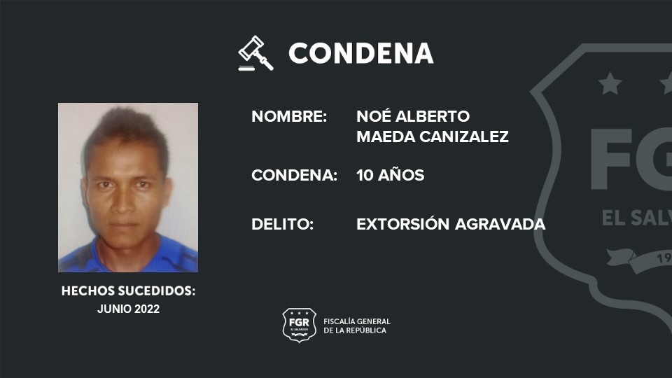 Ahuachapán. Noé Alberto Maeda Canizalez due condenado a diez años de prisión por haber cometido el delito de extorsión agravada. El hecho sucedió en San Francisco Menéndez, Ahuachapán.