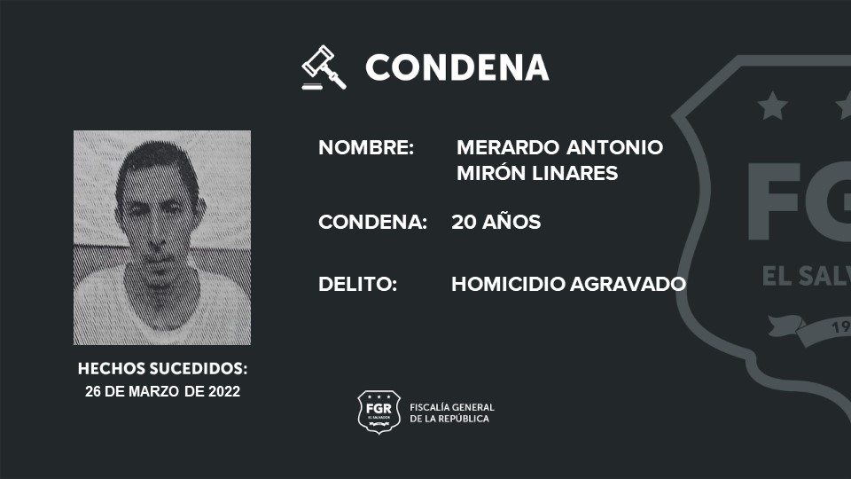 Sonsonate. Con la debida prueba testimonial, la Fiscalía logró una sentencia de prisión de 20 años para Merardo Antonio Mirón Flores, a quien se le declaró cumplable de haber asesinado con arma de fuego a una persona.