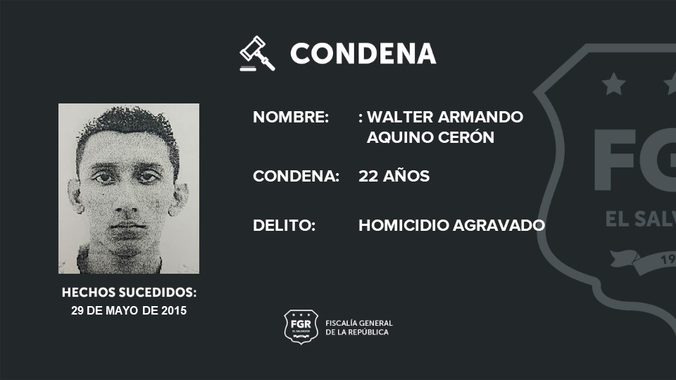 Santa Ana. Walter Armando Aquino Cerón, terrorista de la MS, fue condenado a 22 años de prisión, luego de que la Fiscalía evidenciara que había asesinado a una persona en mayo de 2015, en Coatepeque, Santa Ana.