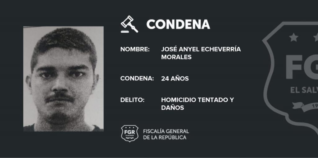 La Libertad. José Anyel Echeverría Morales, pandillero de la MS-13, fue sentenciado a 24 años de cárcel por haber intentado asesinar a tres agentes policiales y dañar el vehículo en el que se conducían; los policías realizaban diligencias de investigación en el municipio de Talnique, La Libertad.