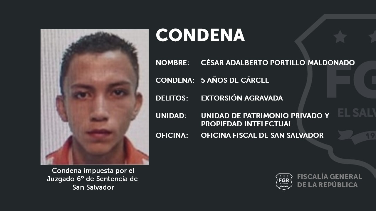 San Salvador. César Adalberto Portillo Maldonado recibió una pena de cinco años de cárcel, por exigir dinero con amenazas de muerte, aseguró la Fiscal del de la Unidad de Patrimonio Privado y Propiedad Intelectual de la oficina de San Salvador.