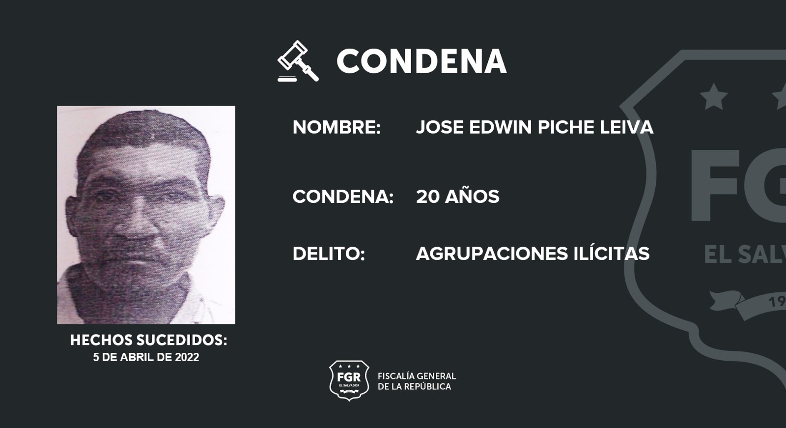 Piche Leiva fue detenido y ahora condenado, gracias al régimen de excepción, que ha permitido procesar penalmente a los miembros de pandilla por su pertenencia a la misma.