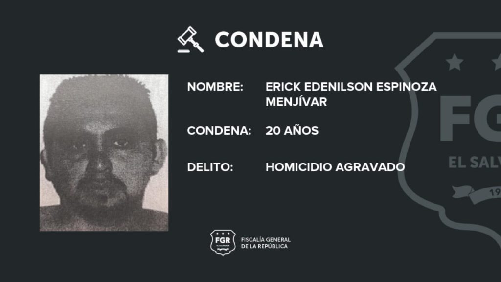 Chalatenango. 20 años de prisión fue la sentencia impuesta para el pandillero Erick Edenilson Espinoza Menjívar por el homicidio de Héctor Salvador López Salguero. En un juicio, la Fiscalía logró evidenciar la culpabilidad del terrorista en el crimen cometido el 2 de febrero del 2012.