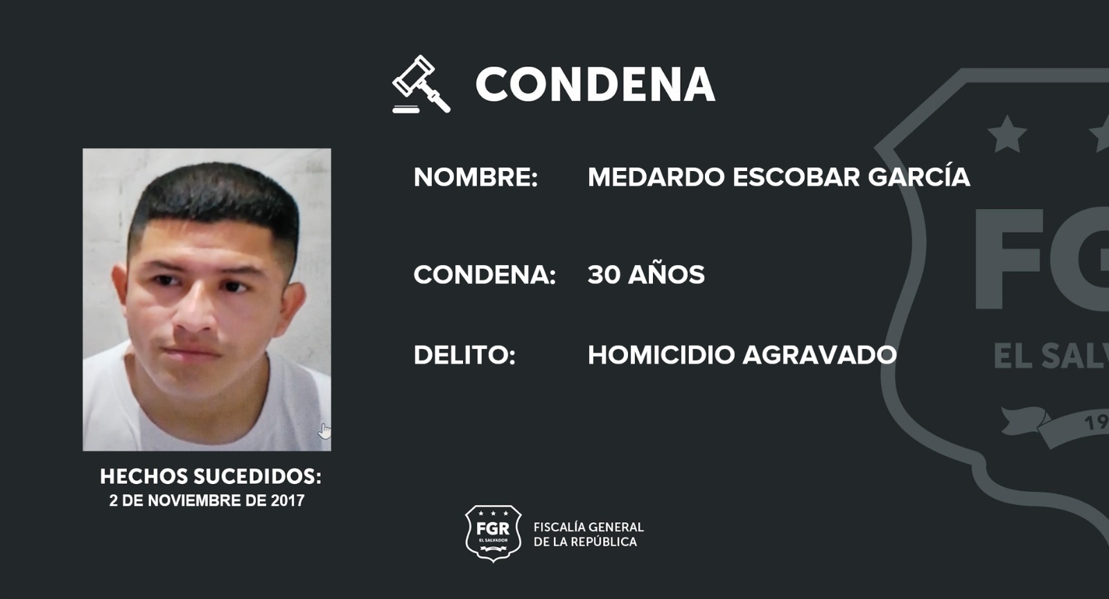 Cojutepeque, Cuscatlán. Luego de una extensa investigación liderada por los fiscales se logró condenar a Medardo Escobar García a 30 años de prisión por el delito de homicidio agravado cometido el 2 de noviembre de 2017 al interior de una milpa ubicada en cantón San José Costa Rica, distrito de San Emigdio, departamento de La Paz.
