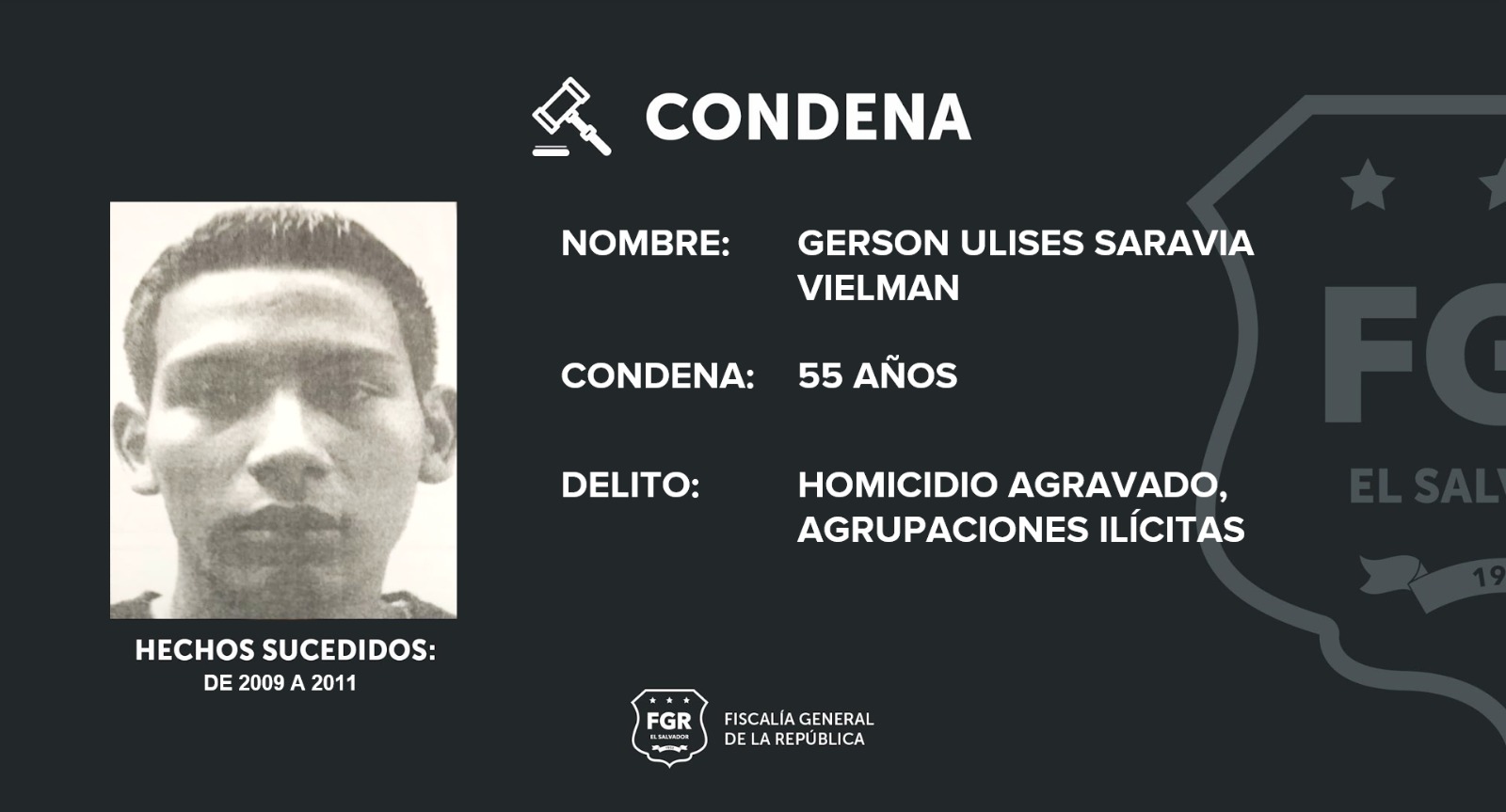 Apopa, San Salvador. Gracias a la investigación realizada por los fiscales, se logró condenar a 55 años de prisión a Gerson Ulises Saravia Vielman, por los delitos de homicidio agravado (dos casos) y agrupaciones ilícitas.