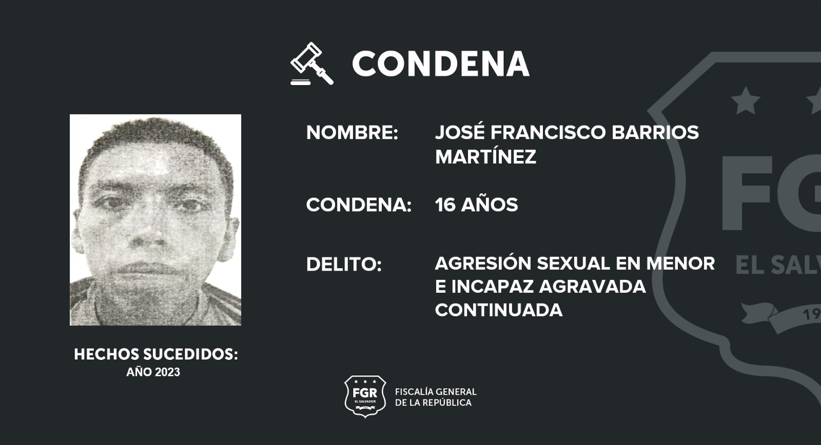 Apopa, San Salvador. José Francisco Barrios Martínez fue condenado a 16 años de prisión por el delito de agresión sexual en menor e incapaz, modalidad continuada, gracias a la investigación realizada por las fiscales. Los hechos ocurrieron durante el año 2023, en una colonia del distrito de Apopa, departamento de San Salvador.