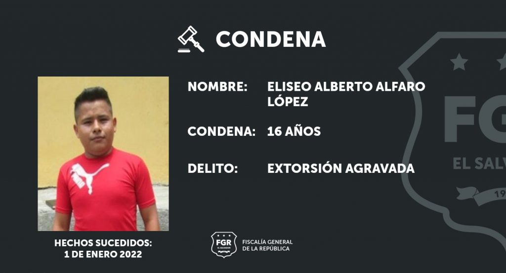 Cojutepeque, Cuscatlán. Gracias a las pruebas presentadas por los fiscales se ha logrado condenar a 16 años de prisión a Eliseo Alberto Alfaro López, por el delito de Extorsión Agravada. El imputado delinquía en el departamento de Cuscatlán y es miembro activo de la pandilla Barrio 18.