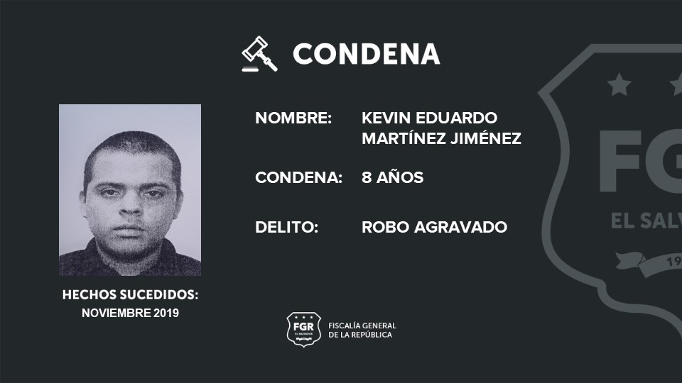 Santa Ana. Kevin Eduardo Martínez Jiménez, miembro de la Mara Salvatrucha, fue sentenciado a ocho años de prisión por robo agravado. La Fiscalía demostró en juicio la culpabilidad del imputado.