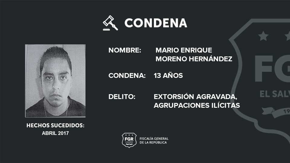Santa Ana. Al demostrar la culpabilidad de Mario Enrique Moreno Hernández, la Fiscalía obtuvo un resultado condenatorio para el imputado acusado de extorsión agravada y agrupaciones ilícitas.