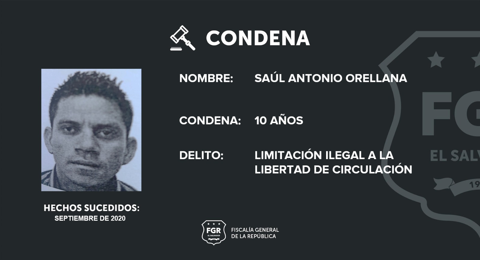 Soyapango, San Salvador Este. Saúl Antonio Orellana, miembro de la Mara Salvatrucha, MS-13, fue condenado en ausencia a 10 años de prisión, por el delito de limitación ilegal a la libertad de circulación, gracias a las pruebas presentadas por los fiscales en el juicio.
