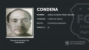 El incriminado se sometió a un proceso abreviado por el cual recibió una condena de 7 años de prisión por el delito de Extorsión Agravada, que le fueron impuestos por el Juzgado de Sentencia de Cojutepeque.