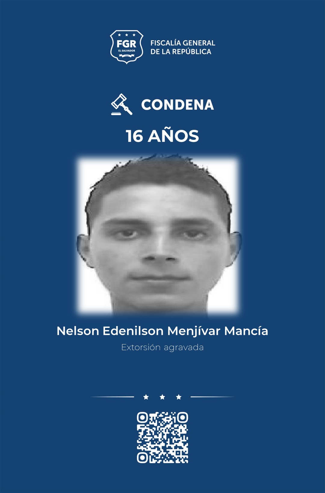 Chalatenango A una pena de 16 años de cárcel fue condenado Nelson Edenilson Menjívar Mancía por haber extorsionado a un comerciante de Nueva Concepción, Chalatenango Centro, durante septiembre del 2011.