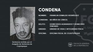 Cojutepeque. Un pandillero de la Mara 18 fue condenado a 60 años de prisión por dos homicidios, uno agravado y uno tentado; cometidos el 14 de agosto de 2019 sobre el kilómetro 23 de la carretera panamericana, a la altura del cantón El Espino, de la jurisdicción de San Pedro Perulapán, departamento de Cuscatlán.