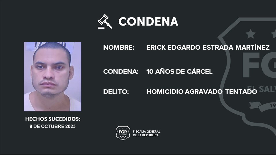 La Libertad Costa. Erick Edgardo Estrada Martínez fue sentenciado a 10 años de prisión por intentar asesinar a una víctima con un envase de vidrio el 8 de octubre del 2023, en la jurisdicción de La Libertad Costa.