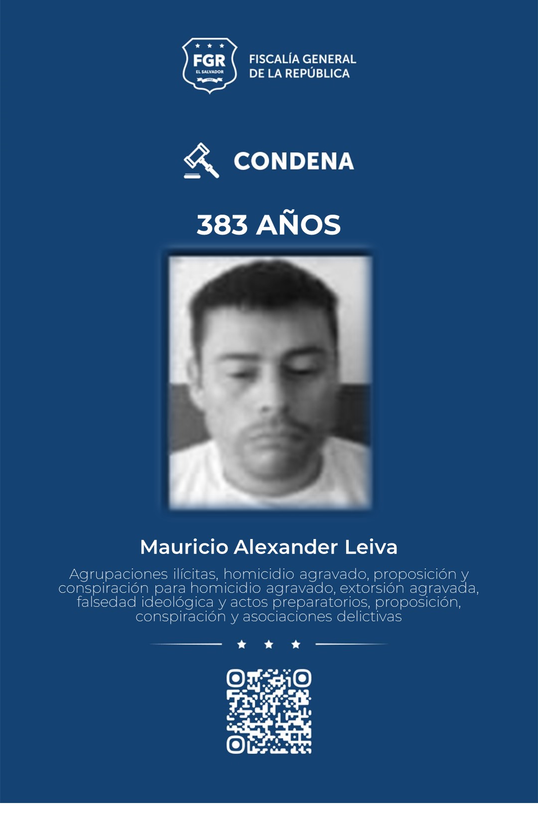 Mientras que Mauricio Alexander Leiva, alias “tun tun”, fue declarado culpable y recibió 383 años por agrupaciones ilícitas, cuatro homicidios agravados, tres proposiciones y conspiraciones para cometer homicidio agravado, 10 extorsiones agravada, falsedad ideológica, actos preparatorios, proposición, conspiración y asociaciones delictivas.
