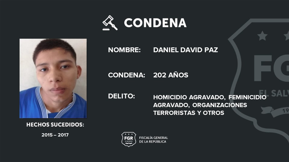 El homeboy Daniel David Paz, alias el inesperado (presente), fue declarado culpable de 5 homicidios agravados, 1 feminicidio agravado y 1 proposición y conspiración para cometer el delito de homicidio agravado y organizaciones terroristas. El tribunal lo sentenció a 202 años de prisión.