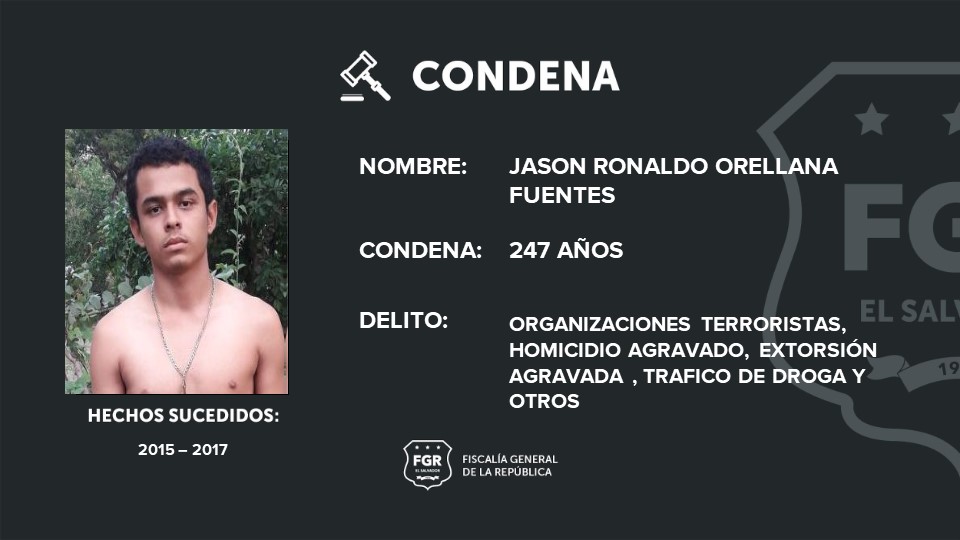 Jason Ronaldo Orellana Fuentes, alias el inadvertido (rebelde), con rango de homeboy, fue sentenciado a 247 años de prisión por organizaciones terroristas, 2 homicidios agravados, 1 tráfico de droga, 7 extorsiones agravadas, 1 intento de homicidio, 3 proposiciones y conspiración para cometer el delito de homicidios agravado.
