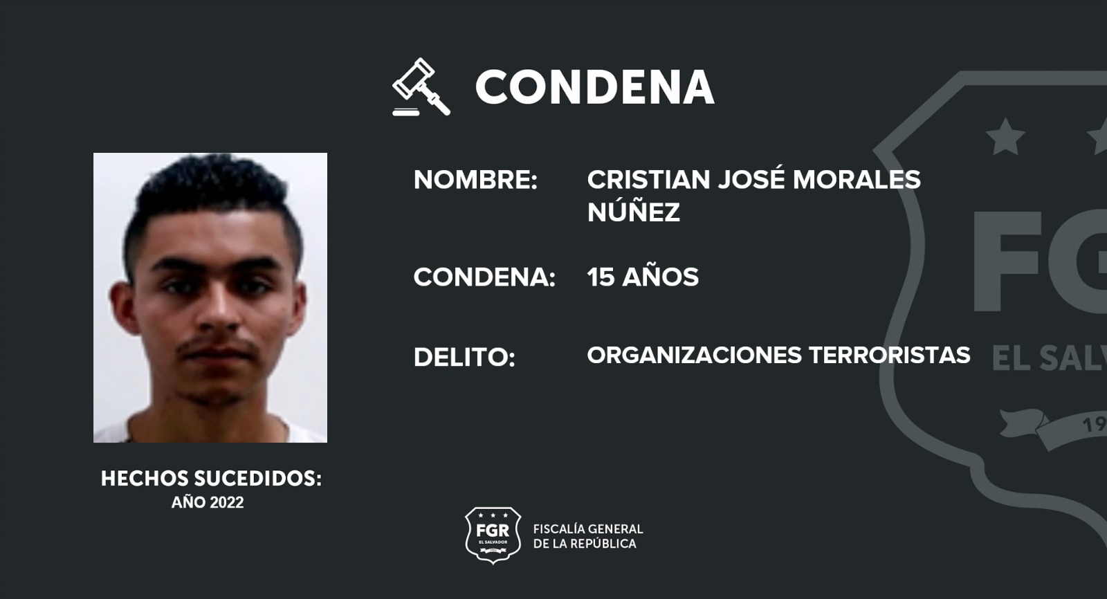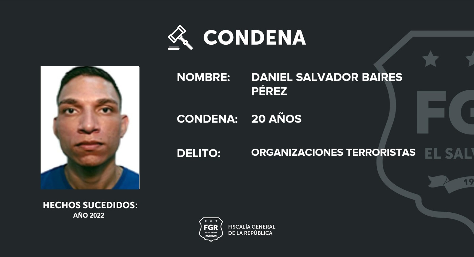 Apopa, San Salvador. Gracias a investigación realizada por los fiscales, se logró condenar a dos miembros de la Mara Máquina por ser miembros activos una organización terrorista; en ese sentido, Daniel Salvador Baires Pérez fue condenado a 20 años de cárcel. Mientras que Cristian José Morales Núñez fue sentenciado a 15 años de prisión.