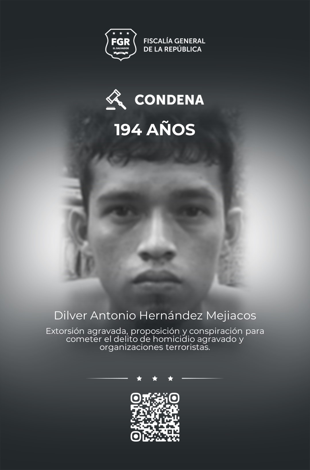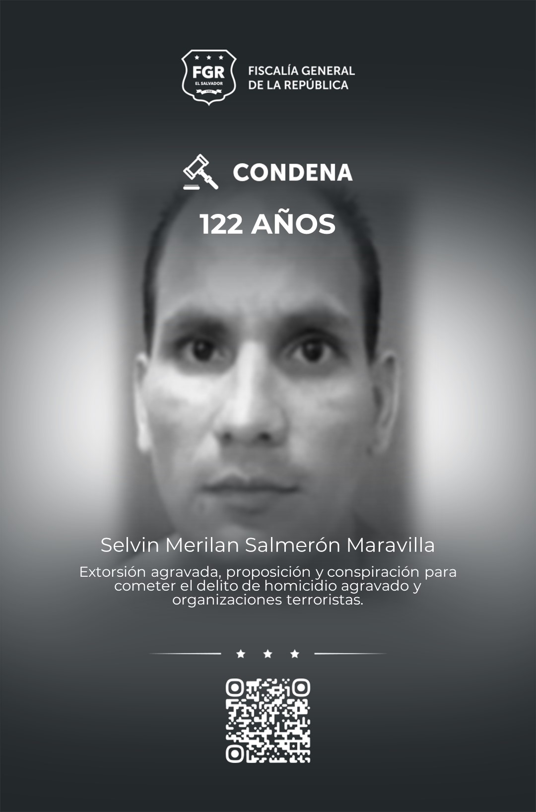 Mientras que Selvin Marilan Salmerón Maravilla fue sentenciado a 122 años de prisión por organizaciones terroristas, proposición y conspiración en el delito de homicidio, y extorsión agravada.