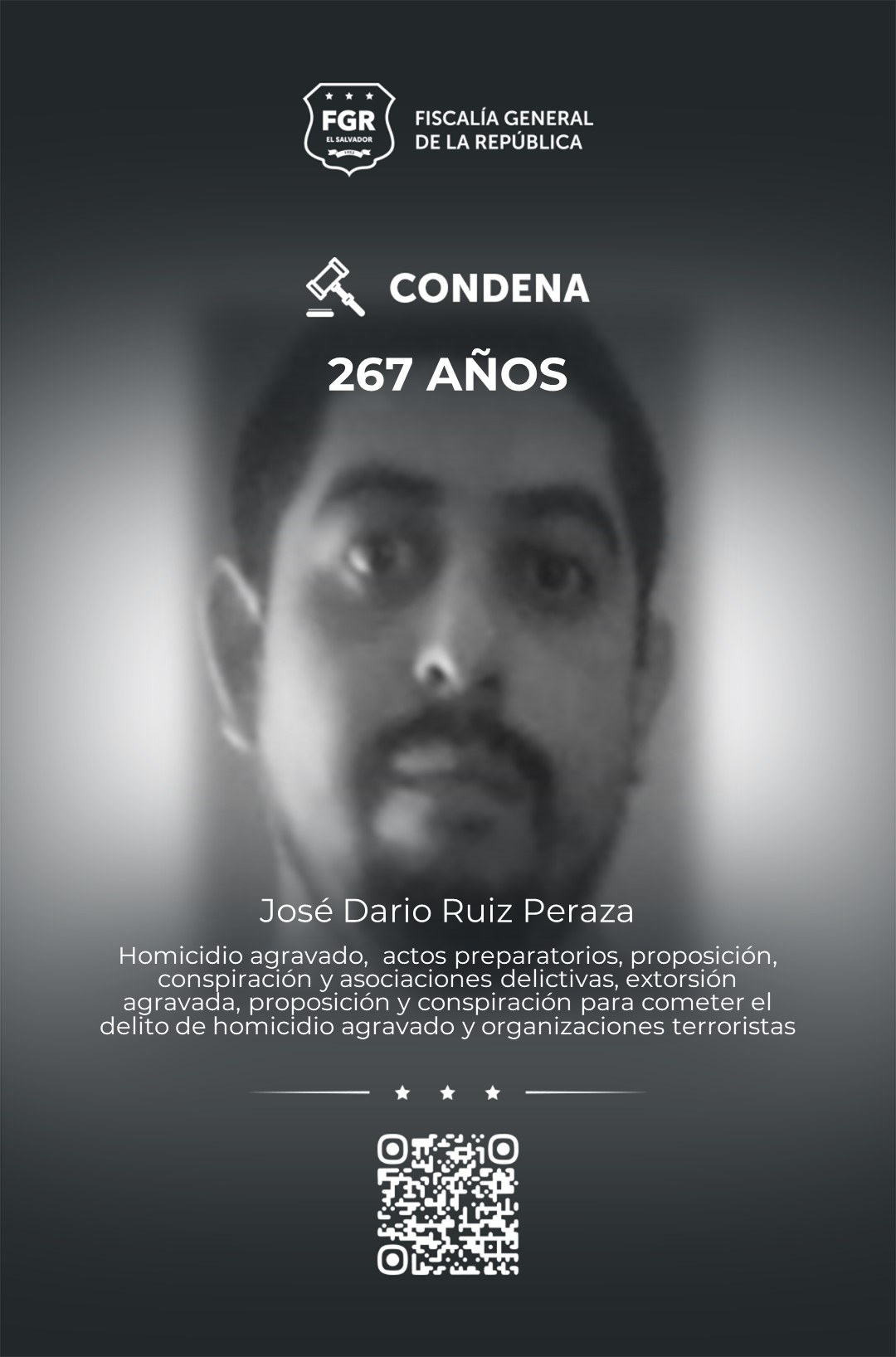 Además, el Tribunal Segundo contra el Crimen Organizado J2 de San Miguel, condenó a José Darío Ruiz Peraza, alias mentiroso, a 267 años de cárcel por homicidio agravado, actos preparatorios, proposición, conspiración y asociaciones delictivas, extorsión agravada, proposición y conspiración en el delito de homicidio, y organizaciones terroristas.