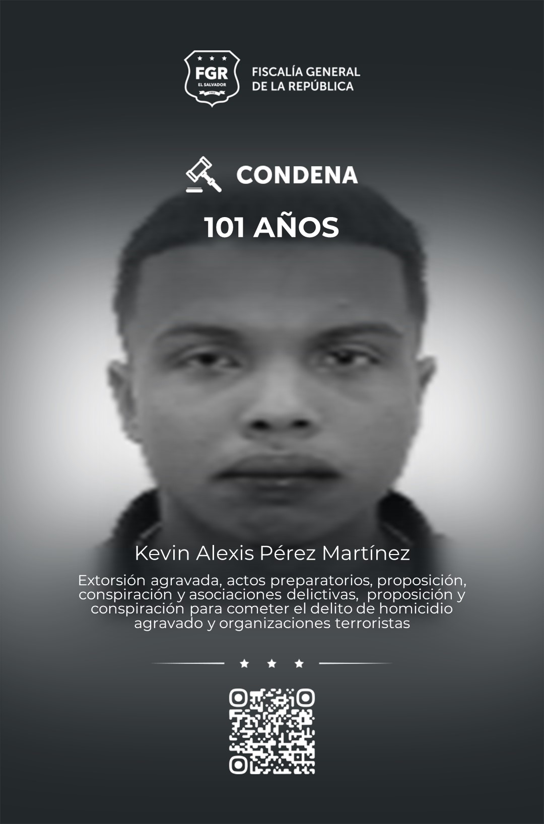 A 101 fue condenado Kevin Alexis Pérez Martínez, alias frizer, por organizaciones terroristas, proposición y conspiración en el delito de homicidio, extorsión agravada, actos preparatorios, proposición, conspiración y asociaciones delictivas.