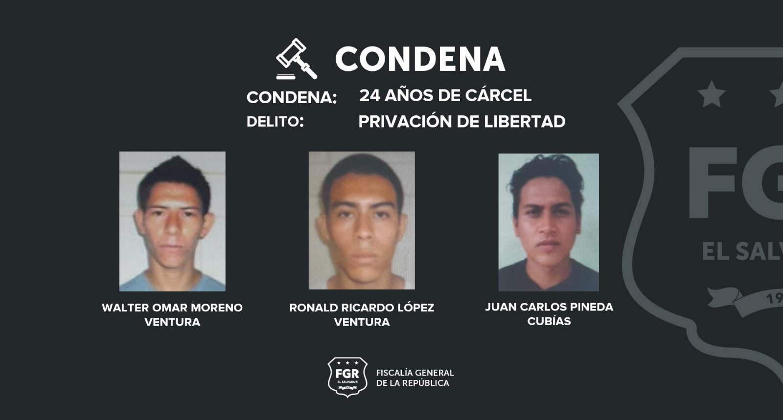 Ilobasco, Cabañas. Gracias a las pruebas presentadas en juicio por la Fiscalía, Juan Carlos Pineda Cubias, Ronald Ricardo López Ventura y Walter Omar Moreno Ventura fueron condenados a 24 años de prisión por haber privado de libertad a cuatro jóvenes el 11 de agosto del año 2016, sobre la carretera que de Sensuntepeque conduce a Ilobasco, a la altura del cantón San Francisco El Dorado, San Isidro, departamento de Cabañas.
