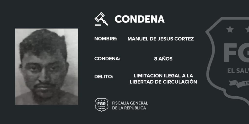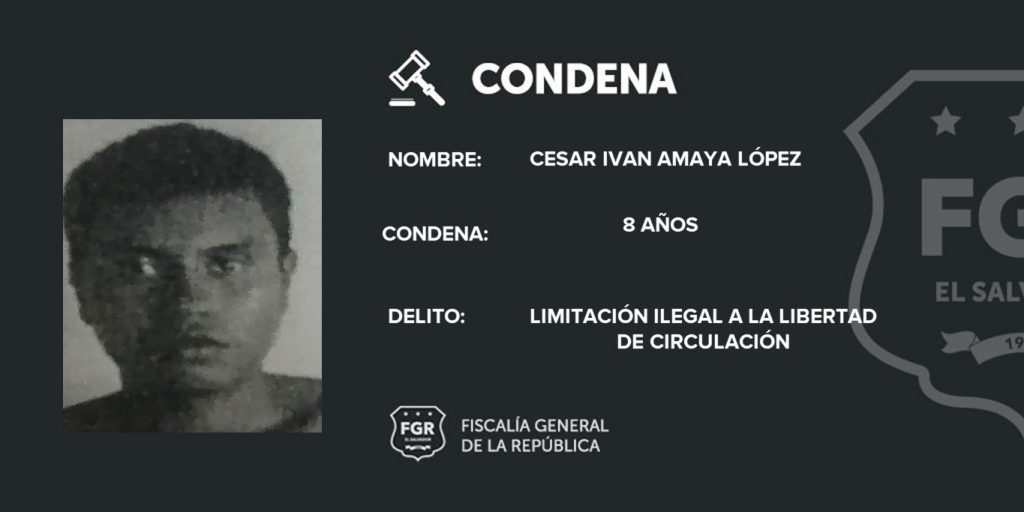 La Libertad. La Fiscalía General de la República (FGR) logró hacer justicia para una víctima que fue amenazada de muerte por pandilleros de la MS que le exigieron abandonar el sector en el que vivía; tras demostrar que habían intimidado a la víctima y su familia, se logró una condena de prisión para Iván Amaya López, alias «Choco» y Manuel de Jesús Cortéz, alias «Mapache».