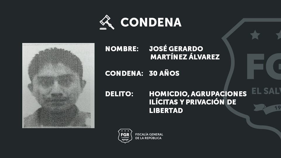 Sonsonate. Juan Antonio Álvarez Pérez, José Gerardo Martínez Álvarez, Santos Alberto Torres Martínez, Edgar Ovidio Tobar Martínez, Ronald Amílcar Tobar Martínez, fueron condenados a penas de prisión de hasta 30 años por haber privado de libertad y asesinar a Rodrigo Alexander Nájera, quien se rehusaba a colaborar con los pandilleros.