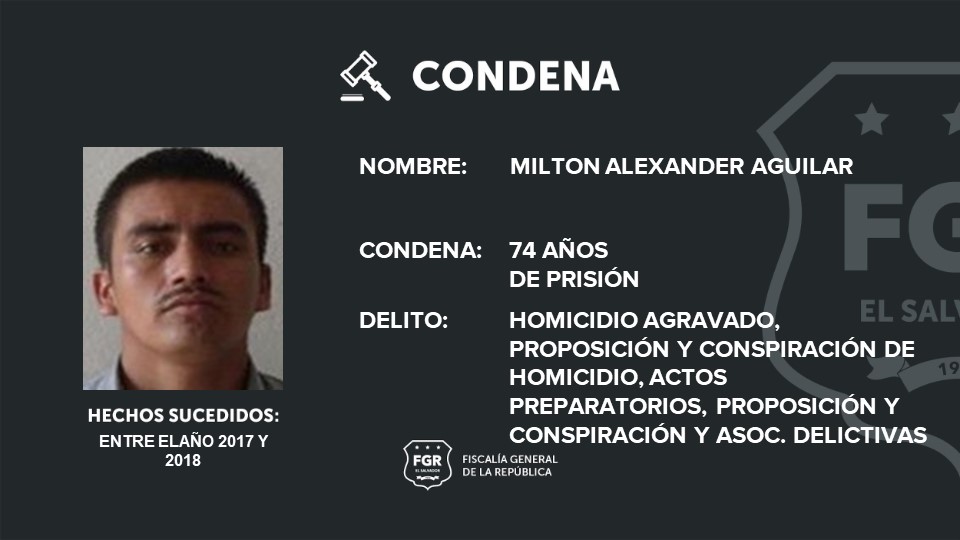 Milton Alexander Aguilar fue condenado a 74 años por ser coautor en un homicidio agravado, por dos casos de proposiciones y conspiración en el delito de homicidio, y por el asociaciones delictivas.