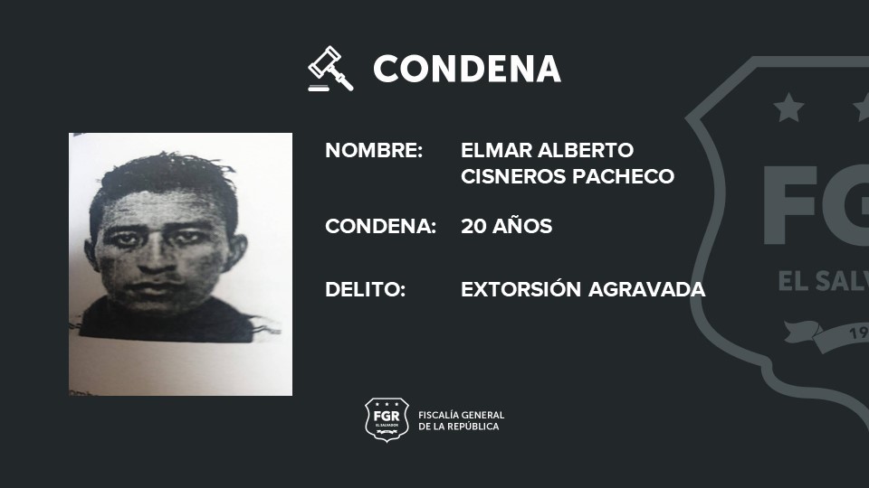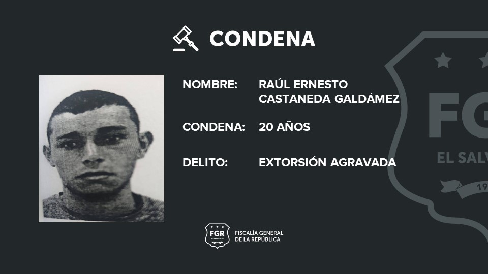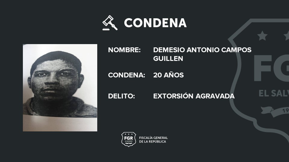 Santa Ana. Demesio Antonio Campos Guillen, Raúl Ernesto Castaneda Galdámez y Elmer Alberto Cisneros Pacheco, todos miembros de la MS, fueron condenados a 20 años de cárcel por haber extorsionado con $500 dólares a una persona honrada del departamento de Santa Ana.