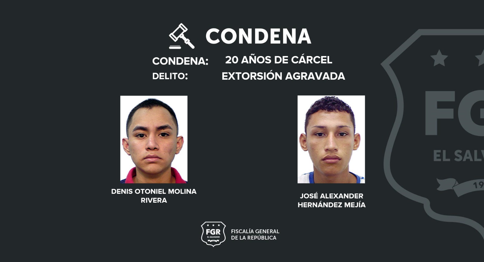 Zacatecoluca, La Paz. Por el delito de extorsión agravada, la Fiscalía logró 20 años de prisión -pena máxima de cárcel por ese delito- para Carlos Elenilson Rivera Rosales, Josué Isaías Hernández Mejía, Ulises Eduardo Rivera Rosales, Douglas Alexander Hernández Suárez, Denis Otoniel Molina Rivera y José Alexander Hernández Mejía. El ilícito se cometió en el departamento de La Paz.