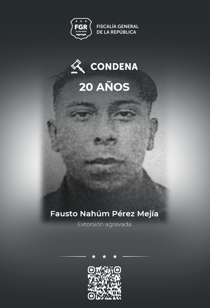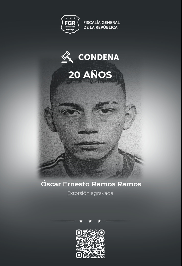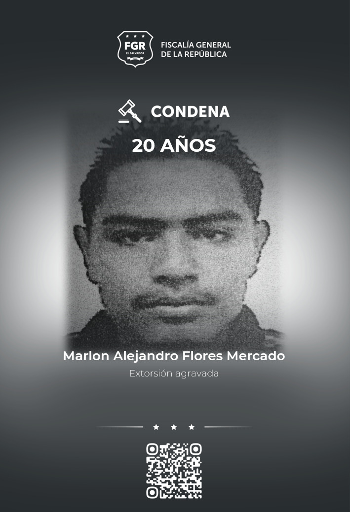 Mejicanos, San Salvador Centro. Marlon Alejandro Flores Mercado, Erick Geovanni Sánchez Rivas, Óscar Ernesto Ramos Ramos y Fausto Nahum Pérez Mejía, miembros de la MS-13, del programa Centrales, clica Altos Crazy, fueron condenados a 20 años de prisión por el delito de extorsión agravada bajo modalidad de delito continuado.