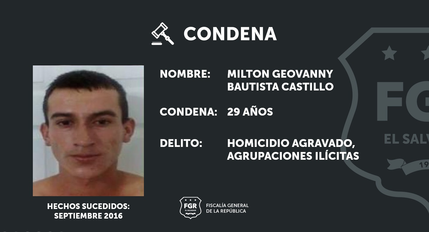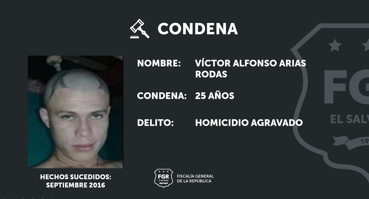 Ilobasco, Cabañas. Durante cuatro días de juicio, los fiscales aportaron abundantes pruebas en contra de Milton Geovanny Bautista Castillo, alias Gudy, y Víctor Alfonso Arias Rodas, quienes finalmente fueron sentenciados a 29 y 25 años respectivamente. Los imputados fueron procesados por el delito de homicidio agravado y agrupaciones ilícitas.