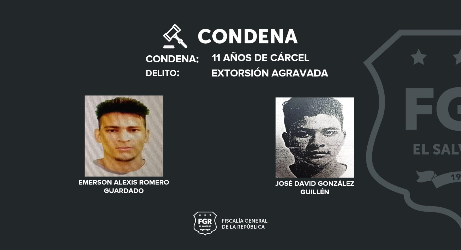 Apopa, San Salvador. José David González Guillén, Emerson Alexis Romero Guardado y José Dolores Méndez Fernández, miembros de la pandilla Barrio 18 revolucionarios, todos imputados presentes, fueron condenados a diferentes penas de prisión por el delito de extorsión agravada, gracias a las investigaciones coordinadas por los fiscales del caso.