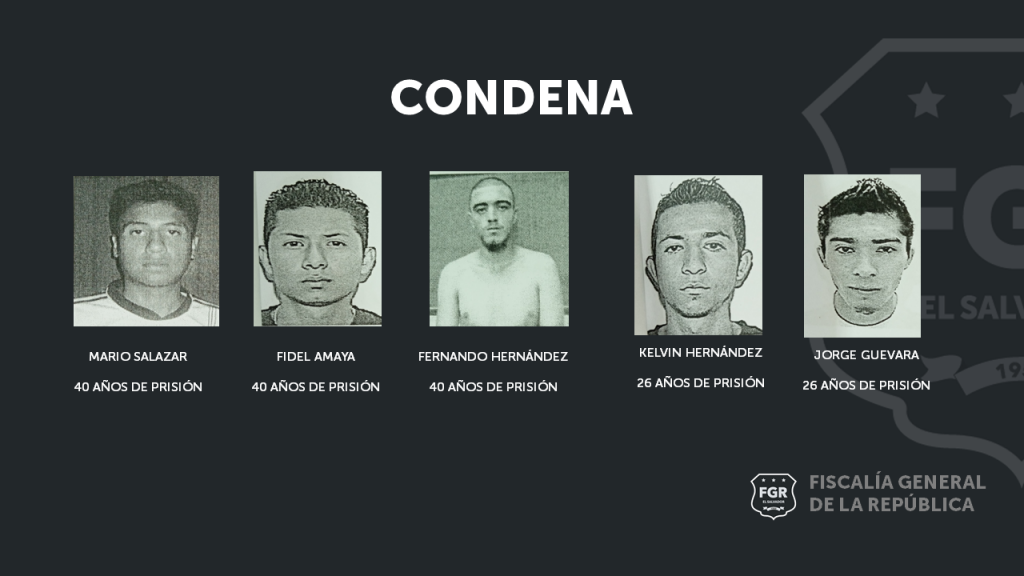 Los imputados y las penas son: Fernando Antonio Hernández Mercado, alias Lunático, Fidel Ernesto Amaya Pérez, a. Wisper, Mario Alexander Salazar Suárez, a. Gallo, fueron condenados a 40 años de prisión por el delito de Homicidio Agravado en su calidad de autores directos. Mientras que, Jorge Osmildo Guevara, alias Eclipse, y Kelvin Alberto Hernández, a. Larry, fueron sentenciados a 26 años de cárcel, por el delito de Homicidio Agravado, en su calidad de Cómplices Necesarios.