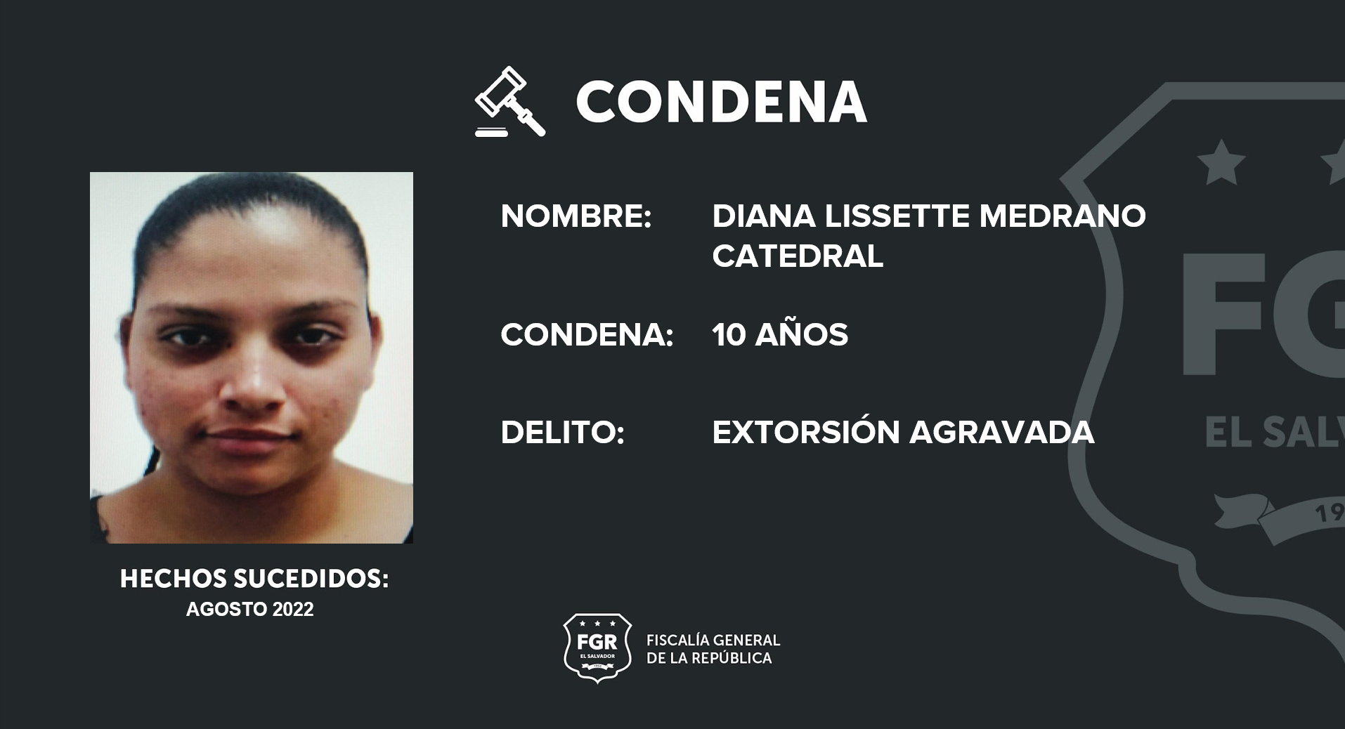 Apopa, San Salvador Oeste. Rogelio Manfredo Sánchez Hércules y Diana Liseth Medrano Catedral fueron sentenciados a 11 y 10 años de prisión, respectivamente, por el delito de extorsión agravada. Las pruebas presentadas en juicio por los fiscales fueron suficientes para evidenciar la culpabilidad de los imputados.