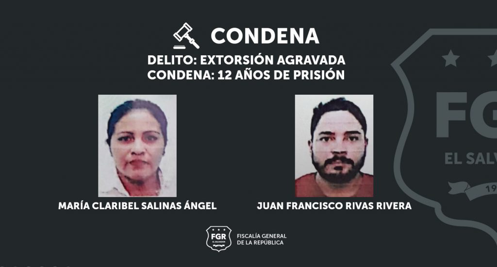 Ilobasco, Cabañas. Un hombre y una mujer fueron condenados a 12 años de cárcel por el delito de Extorsión Agravada, en perjuicio de un empresario del departamento de Cabañas. Los sentenciados fueron identificados como: Juan Francisco Rivas Rivera, María Claribel Salinas Ángel, a quienes se perfiló como miembros de la Mara Salvatrucha.
