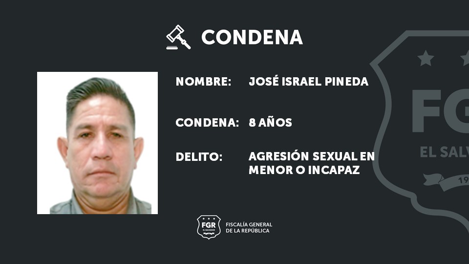 Ahuachapán. José Israel Pineda fue condenado a ocho años de cárcel luego que la Fiscalía comprobó en un juicio que él había agredido sexualmente a una adolescente de 12 años. El imputado dirigía como pastor una iglesia en Ahuachapán, y la menor y su familia se congregaban en la misma.