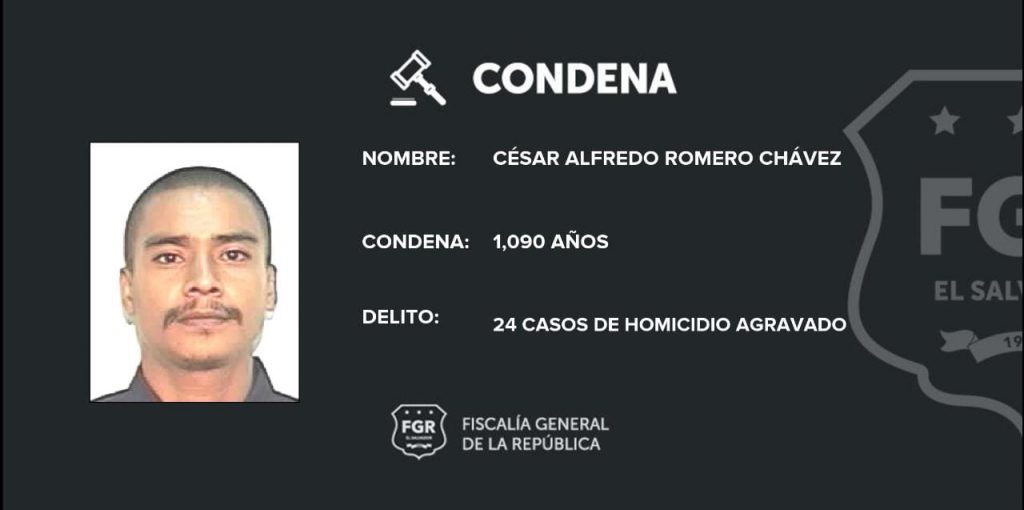 Una estructura delincuencial de 94 pandilleros pertenecientes a la MS-13 miembros del programa «Libertad», fueron condenados este viernes por el Tribunal Especializado de Sentencia «A» luego de valorar y dar credibilidad a las investigaciones realizadas por fiscales de las Unidades Especializadas Antihomicidios y de Persona Desaparecidas. La sentencia más contundente fue para César Alfredo Romero Chávez, alias “El Solo de Tecla”, un corredor (CABECILLA) del referido programa quien fue condenado a 1,090 años de prisión por varios delitos, incluyendo el homicidio agravado de 24 personas ocurridos entre los años 2017 al 2019.