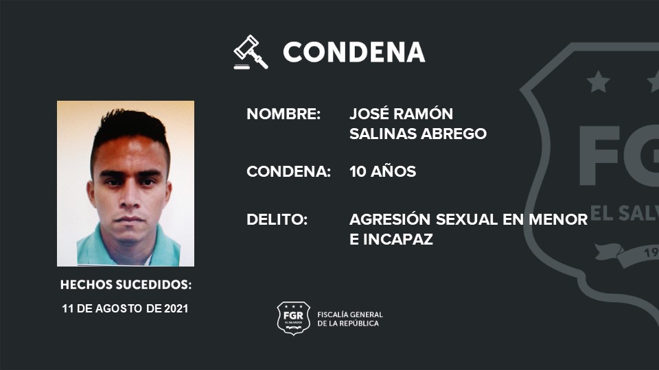 Santa Tecla. José Ramón Salinas Abrego fue condenado a diez años de cárcel luego de comprobar que el imputado habría agredido sexualmente a una menor de edad en Chiltiupán, La Libertad.