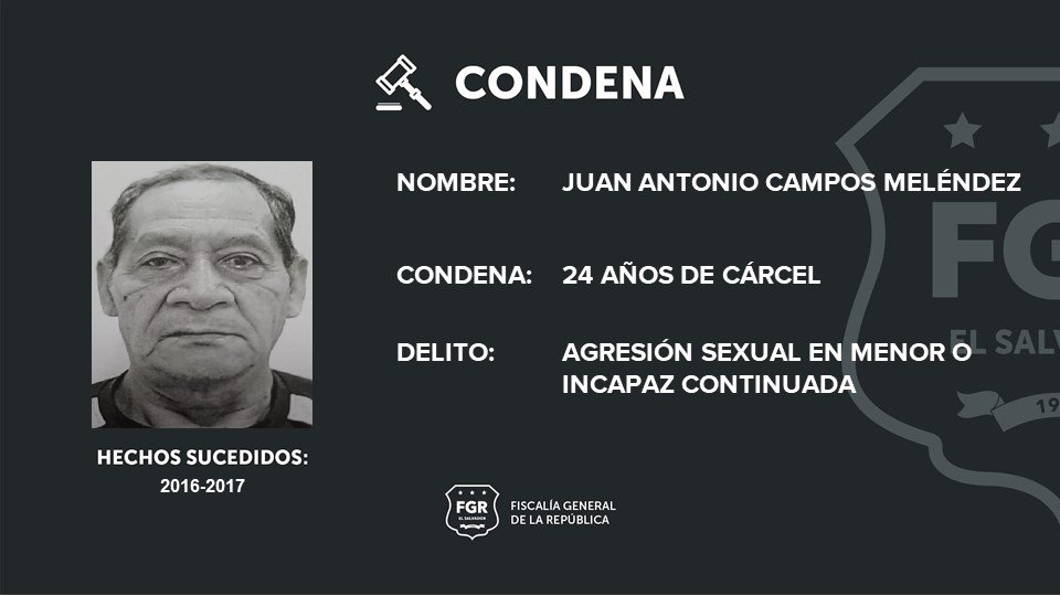 La Libertad Este. La Fiscalía General de la República (FGR) logró 24 años de cárcel para Juan Antonio Campos Meléndez por haber agredido sexualmente a dos menores de 9 y 12 años de edad; los abusos se cometieron entre los años 2016 y 2017 en Colón, La Libertad Oeste.