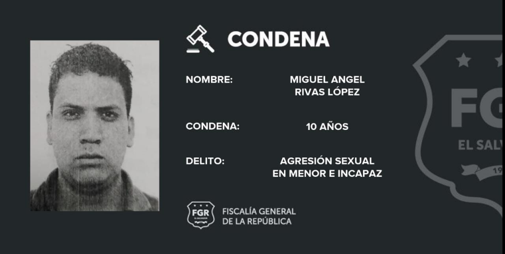 La sentencia condenatoria fue impuesta por el Tribunal Segundo de Sentencia de Santa Tecla; en la audiencia, el juez admitió la prueba presentada por fiscales de la Unidad de Atención Especializada para la Mujer, Niñez y Adolescencia (UAEMNA) de Oficina Zaragoza, lo declaró culpable y fue condenado por el delito de Agresión Sexual en Menor e Incapaz.