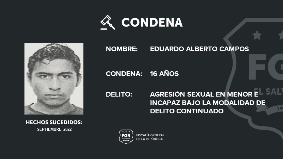 Santa Ana. Por haber cometido el delito de agresión sexual, Eduardo Alberto Campos fue sentenciado a 16 años de prisión luego que la Fiscalía presentara abundantes pruebas en su contra en el juicio realizado en el Tribunal Primero de Sentencia de Santa Ana.