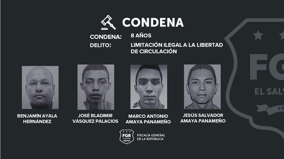 Los sentenciados son integrantes de la pandilla 18 revolucionarios, y fueron identificados como: Nelson Benjamín Recinos Meléndez, Marco Antonio Amaya Panameño, Benjamín Ayala Hernández, José Bladimir Vásquez Palacios y Jesús Salvador Amaya Panameño.