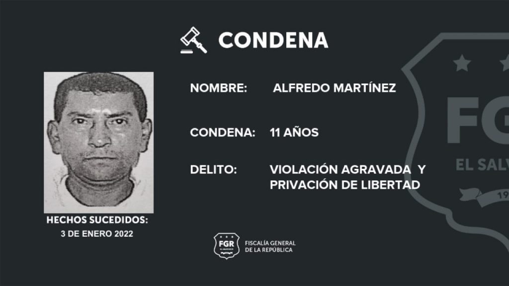 Santa Tecla, La Libertad. Alfredo Martínez fue condenado a 11 años de prisión por haber colaborado para privar de libertad a una mujer y violarla. Los hechos sucedieron en una zona rural de Comasagua, La Libertad.