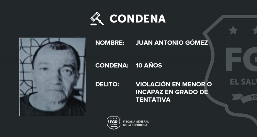 Ilobasco, Cabañas. La Fiscalía General de la República logró condenar a Juan Antonio Gómez a diez años de prisión por el delito de Violación en Menor o Incapaz, en grado de tentativa (intento de violación) en perjuicio de una mujer adulto mayor. El imputado era conocido de la familia de la víctima.
