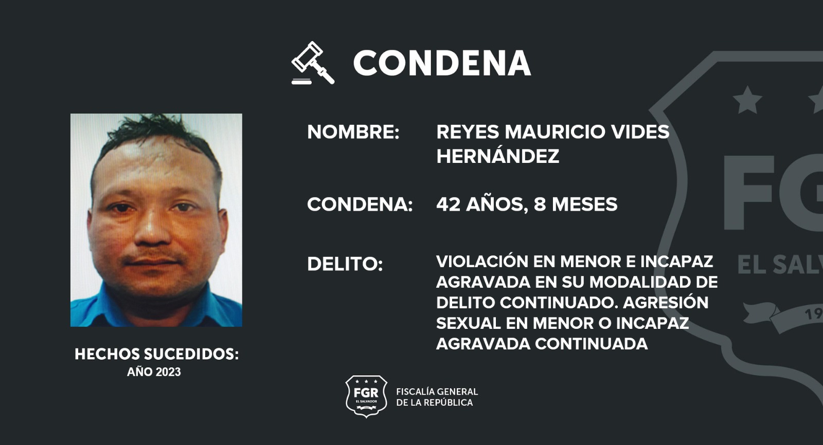 Mejicanos, San Salvador. Gracias a la sólida investigación realizada por las fiscales se logró condenar a Reyes Mauricio Vides Hernández a 42 años y 8 meses de prisión por los delitos de violación en menor e incapaz agravada en su modalidad de delito continuado y agresión sexual en menor o incapaz agravada continuada.