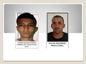 La Unidad de Patrimonio Privado de esta sede fiscal, giro órdenes de detención administrativa, contra los implicados, las cuales fueron efectivas durante operativo desarrollado por la Policía Nacional Civil, entre el 28 y 29 de noviembre recién pasado, por el delito de Extorsión Agravada, los que fueron identificados como: Walter Arquímedes Pineda, alias “Grillo  o Topillillo” de 33 años, y Christian Eduardo Cornejo Rodríguez, alias “Cristian, Levanta Pesas”, de 27 años; este último intimado en el Centro Penal de Chalatenango; manifestó el jefe de esta oficina fiscal Andrés Amaya.